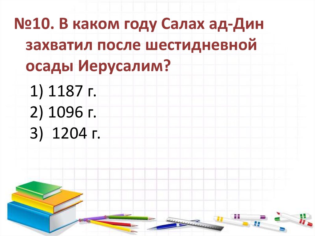 №10. В каком году Салах ад-Динзахватил после шестидневной