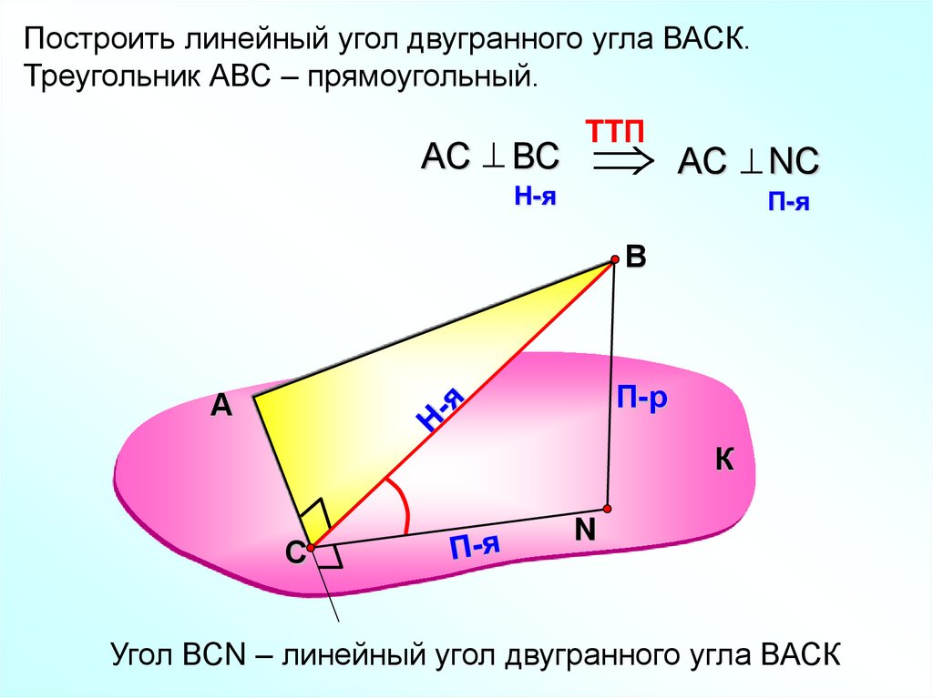 Построить линейный угол двугранного угла ВАСК.Треугольник АВС – прямоугольный.