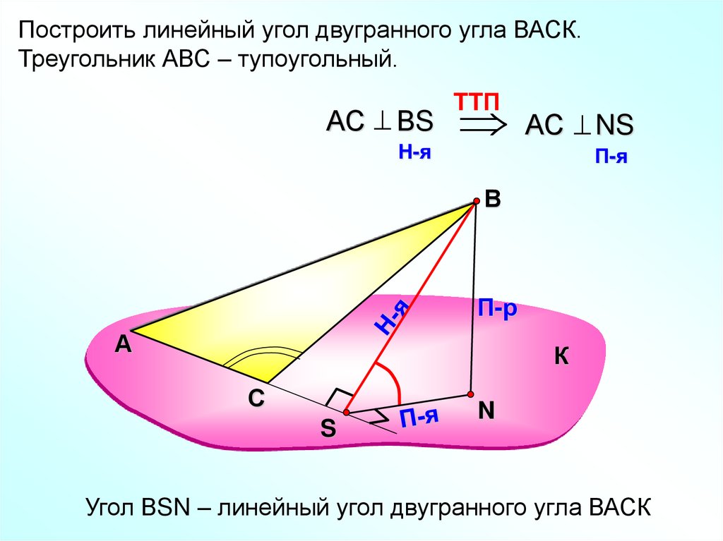 Построить линейный угол двугранного угла ВАСК.Треугольник АВС – тупоугольный.