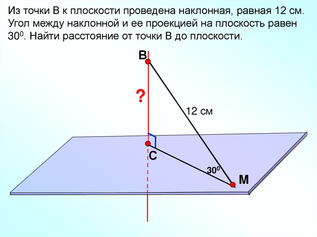 Из точки В к плоскости проведена наклонная, равная 12 см.Угол между наклонной и ее проекцией на плоскость равен