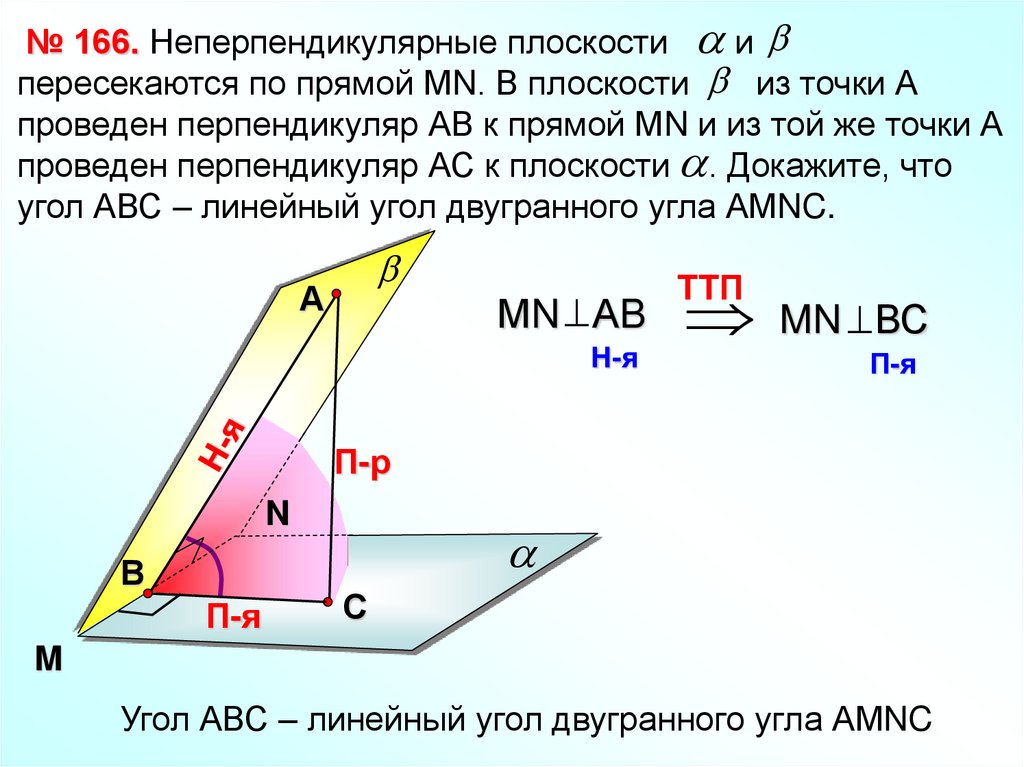 № 166. Неперпендикулярные плоскости ипересекаются по прямой МN. В плоскости из точки А