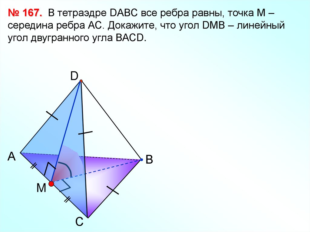 № 167. В тетраэдре DАВС все ребра равны, точка М –середина ребра АС. Докажите, что угол DМВ – линейный