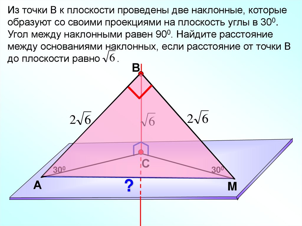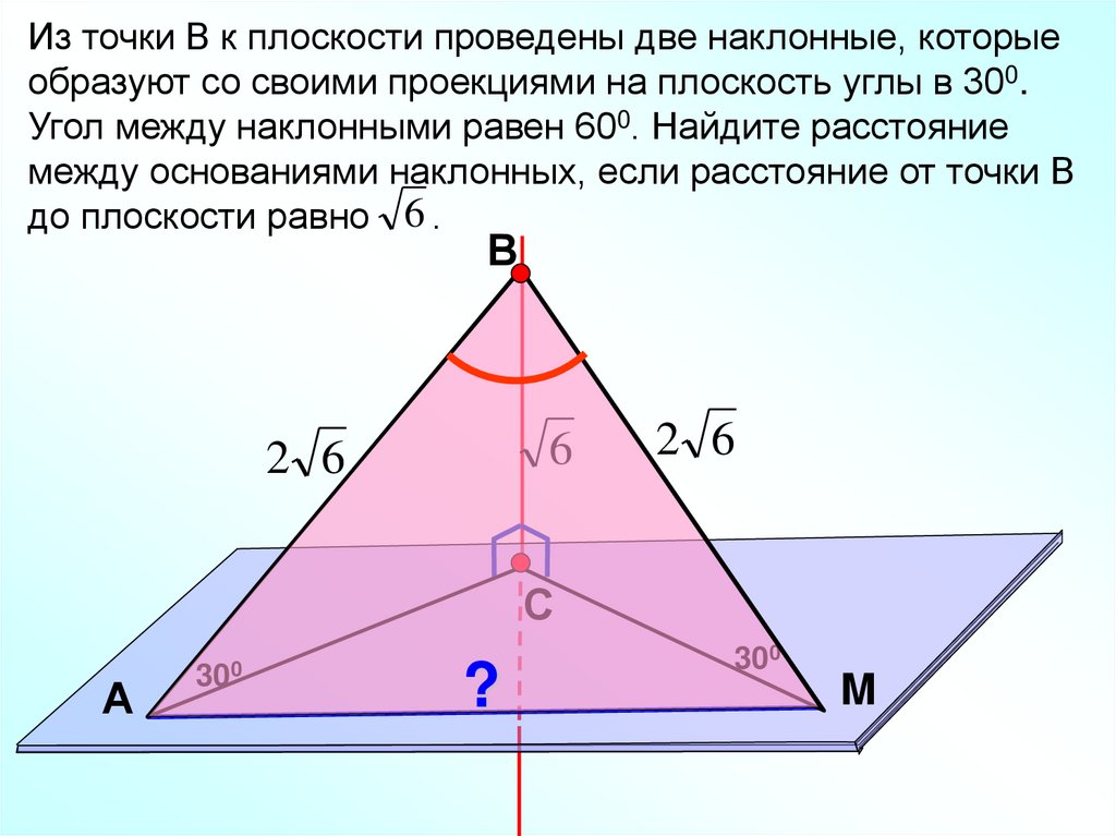 Из точки В к плоскости проведены две наклонные, которыеобразуют со своими проекциями на плоскость углы в 300.