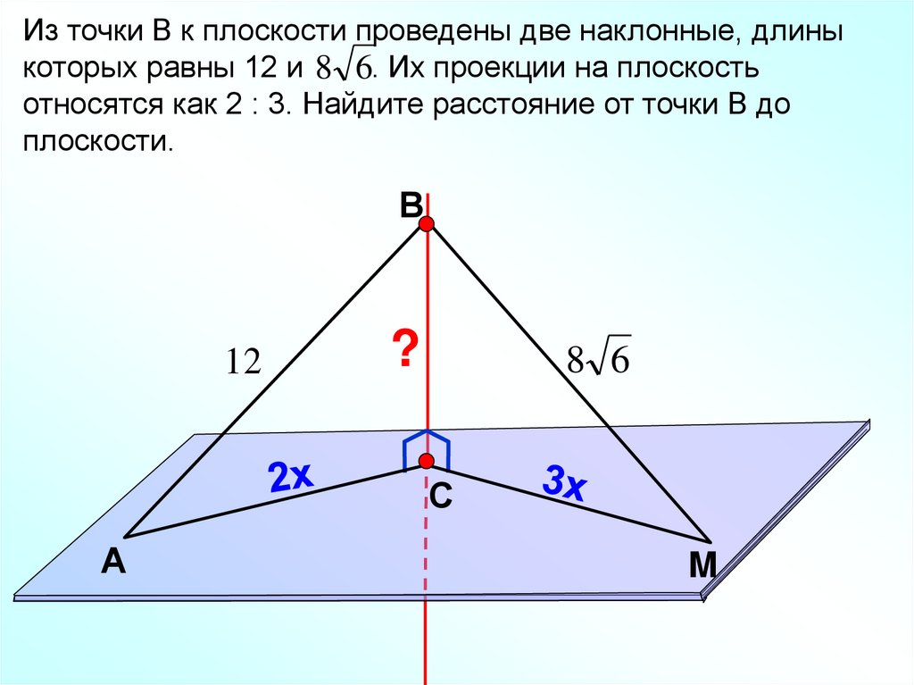 Из точки В к плоскости проведены две наклонные, длиныкоторых равны 12 и 8 6. Их проекции на плоскость