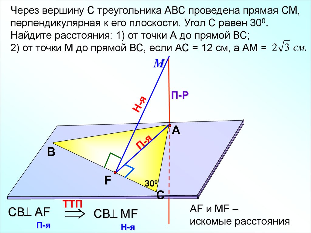2) от точки М до прямой ВС, если АС = 12 см, а АМ = 2 3 см.
