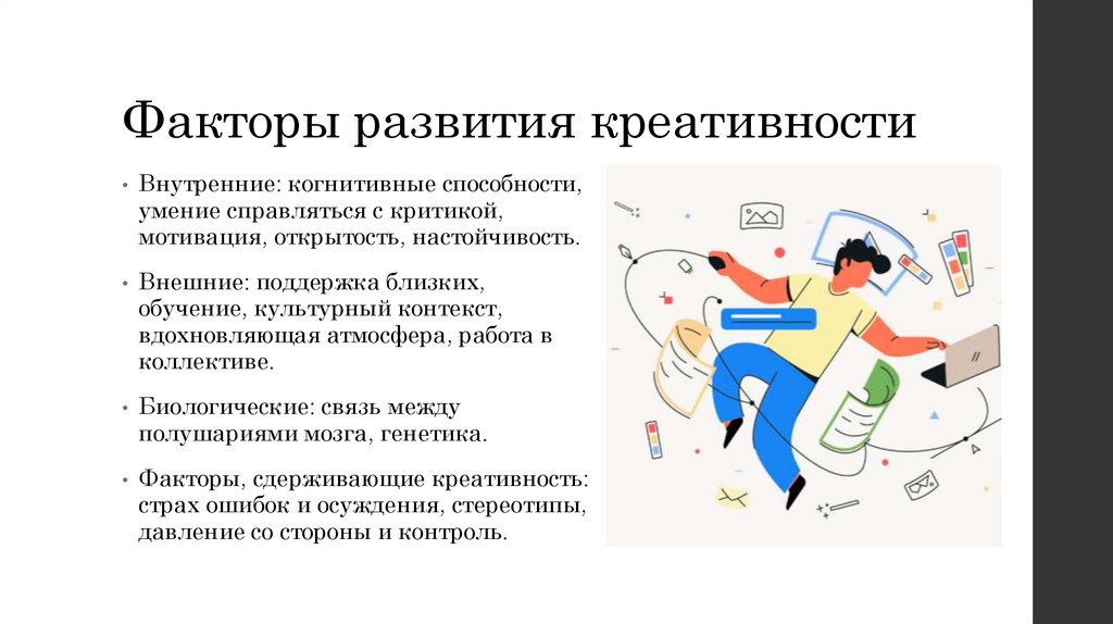 Факторы развития креативности• Внутренние: когнитивные способности,