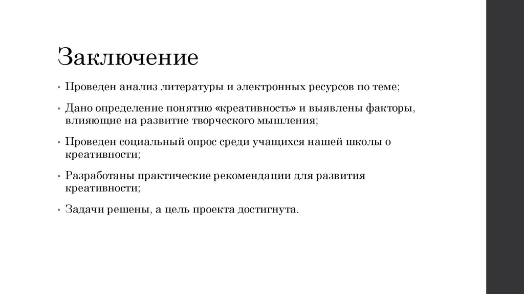 • Дано определение понятию «креативность» и выявлены факторы,