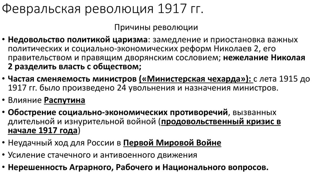 • Нерешенность Аграрного, Рабочего и Национального вопросов.