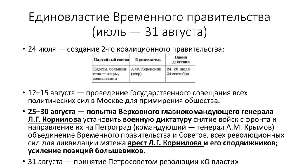 • 25–30 августа — попытка Верховного главнокомандующего генерала
