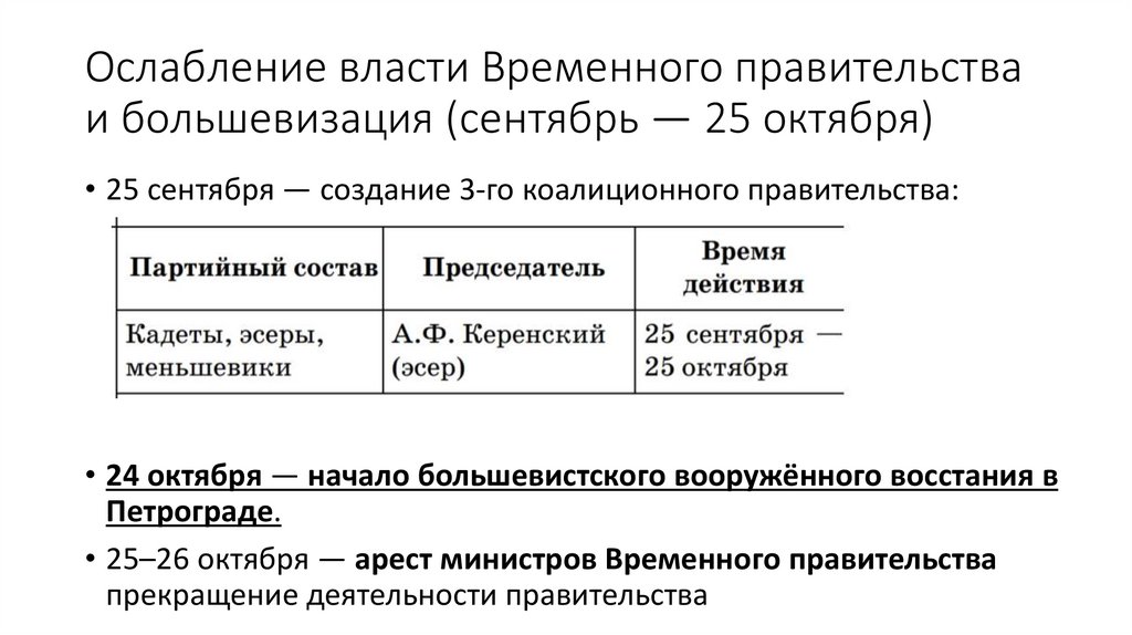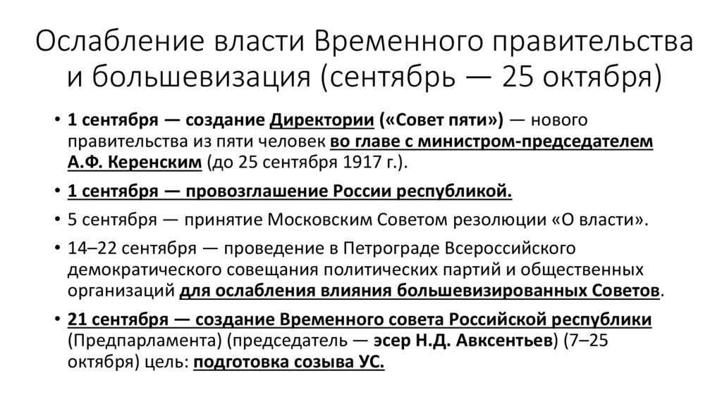 Ослабление власти Временного правительстваи большевизация (сентябрь — 25 октября)