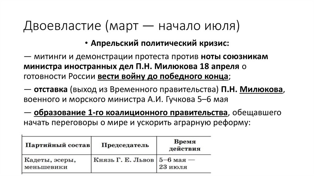 Двоевластие (март — начало июля)• Апрельский политический кризис: