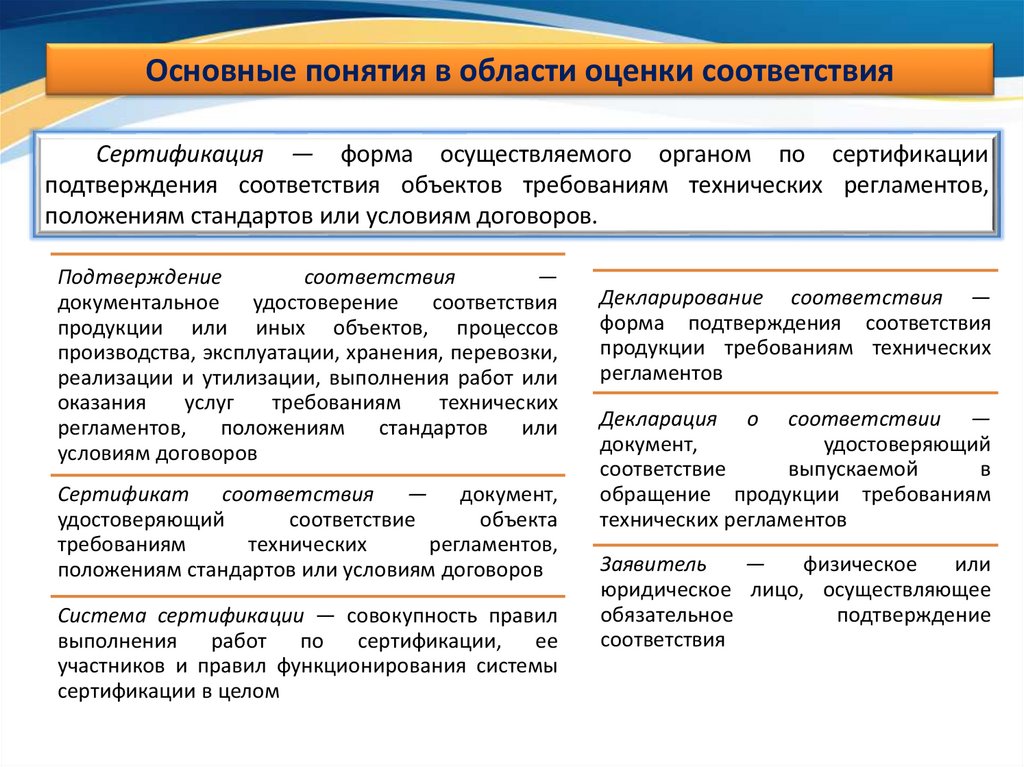 Основные понятия в области оценки соответствияСертификация — форма осуществляемого органом по сертификации