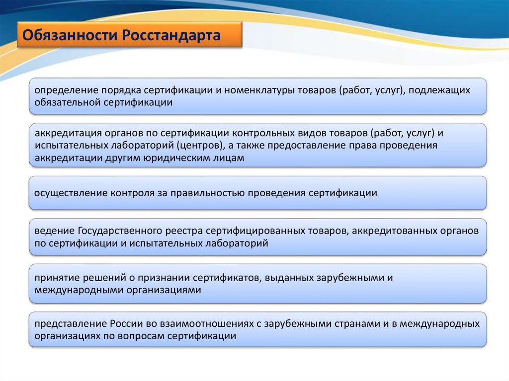 Обязанности Росстандартаопределение порядка сертификации и номенклатуры товаров (работ, услуг), подлежащих