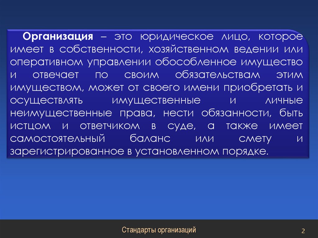 Организация – это юридическое лицо, котороеимеет в собственности, хозяйственном ведении или