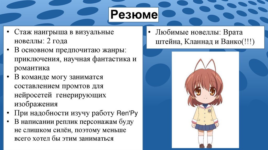Резюме• Стаж наигрыша в визуальные