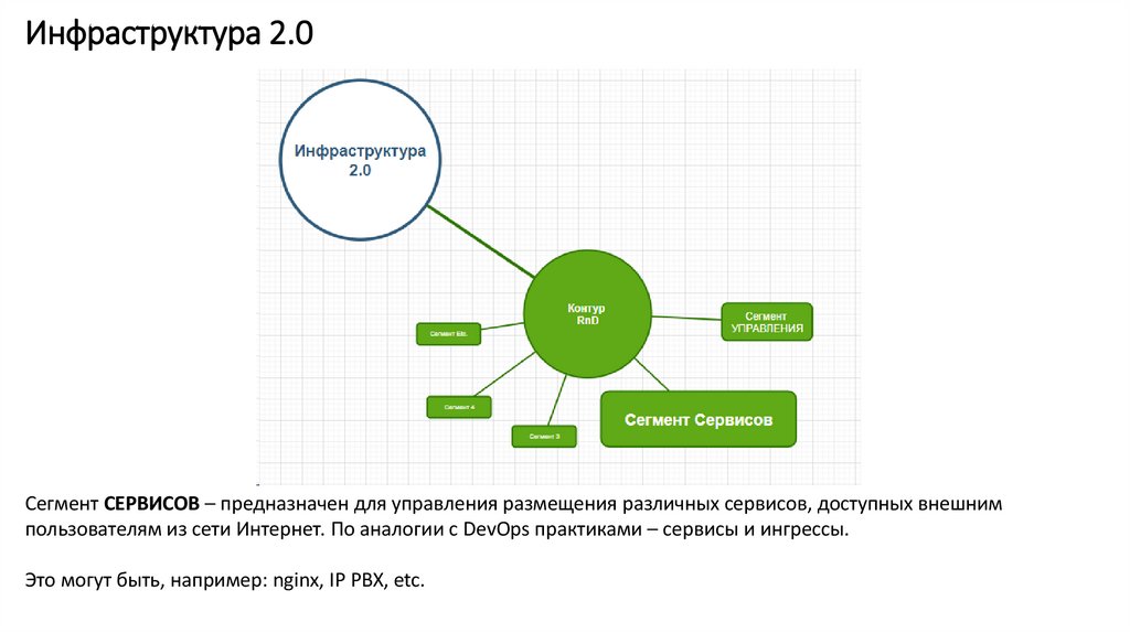 Инфраструктура 2.0Сегмент СЕРВИСОВ – предназначен для управления размещения различных сервисов, доступных внешним