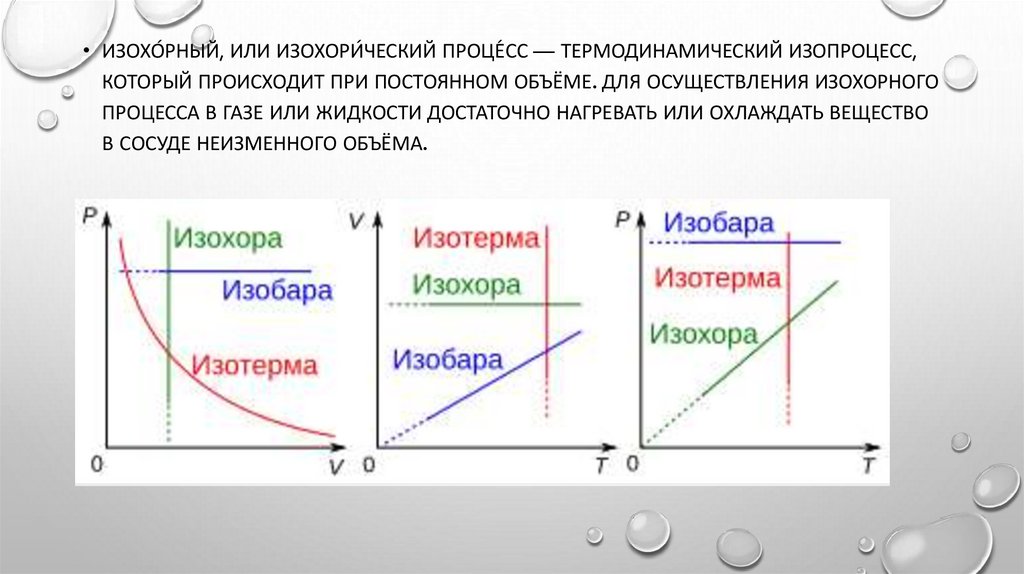 • ИЗОХО́РНЫЙ, ИЛИ ИЗОХОРИ́ЧЕСКИЙ ПРОЦЕ́СС — ТЕРМОДИНАМИЧЕСКИЙ ИЗОПРОЦЕСС,КОТОРЫЙ ПРОИСХОДИТ ПРИ ПОСТОЯННОМ ОБЪЁМЕ. ДЛЯ ОСУЩЕСТВЛЕНИЯ ИЗОХОРНОГО
