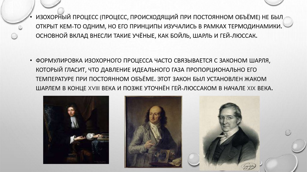 • ИЗОХОРНЫЙ ПРОЦЕСС (ПРОЦЕСС, ПРОИСХОДЯЩИЙ ПРИ ПОСТОЯННОМ ОБЪЁМЕ) НЕ БЫЛОТКРЫТ КЕМ-ТО ОДНИМ, НО ЕГО ПРИНЦИПЫ ИЗУЧАЛИСЬ В РАМКАХ ТЕРМОДИНАМИКИ.