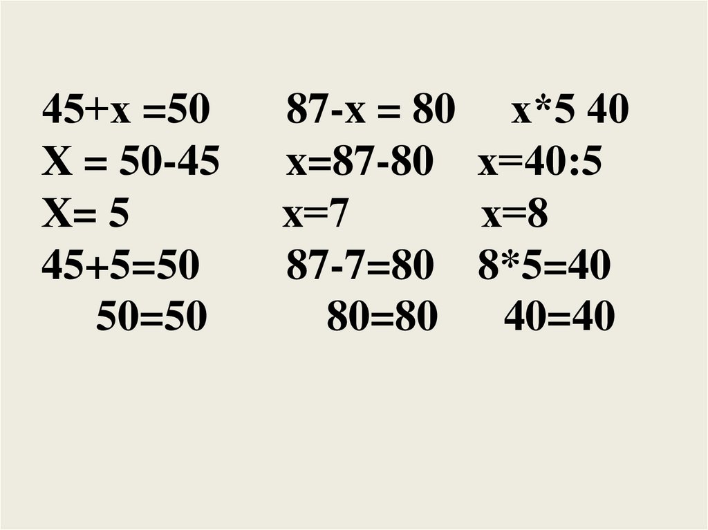 x=87-80 х=40:5