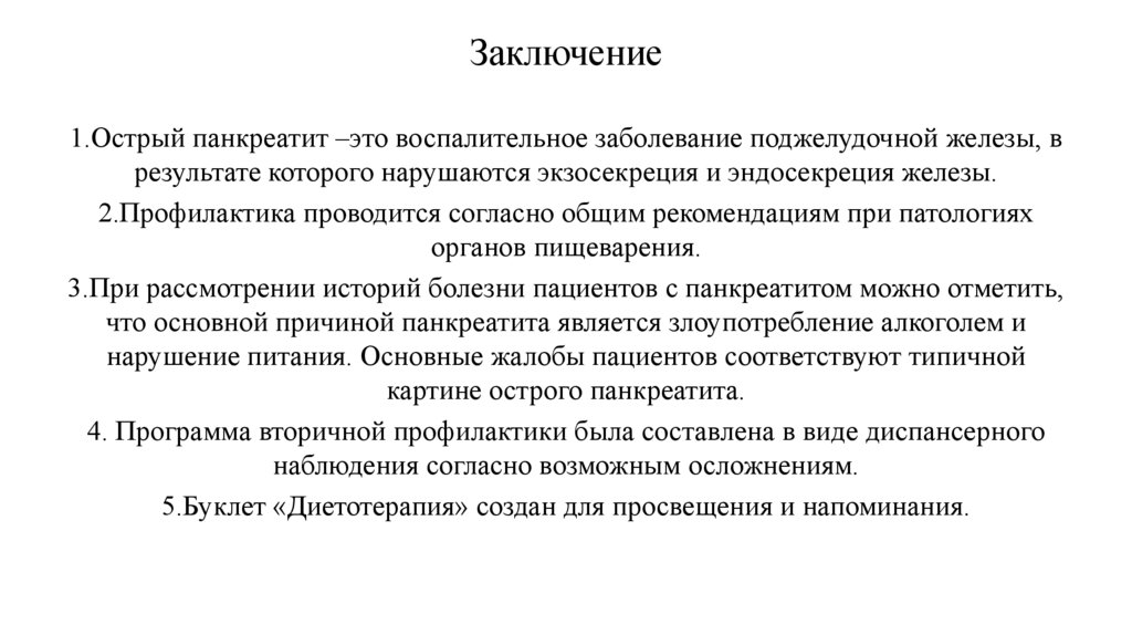 Заключение1.Острый панкреатит –это воспалительное заболевание поджелудочной железы, в