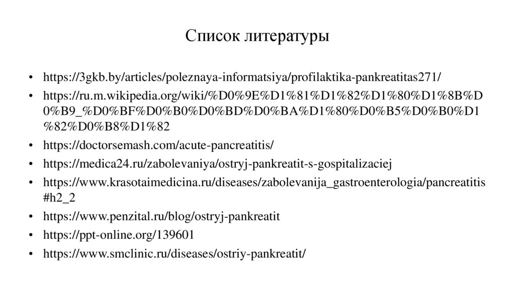 Список литературы• https://3gkb.by/articles/poleznaya-informatsiya/profilaktika-pankreatitas271/