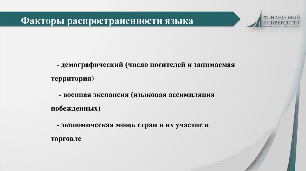 Факторы распространенности языка- демографический (число носителей и занимаемая