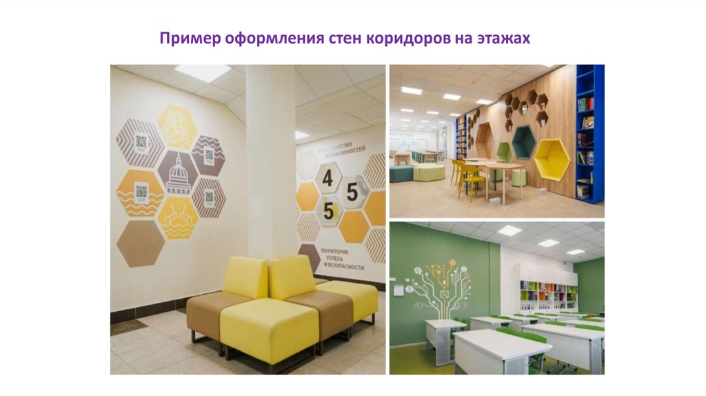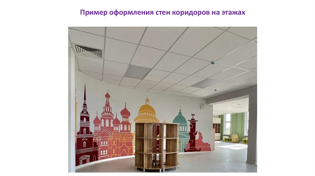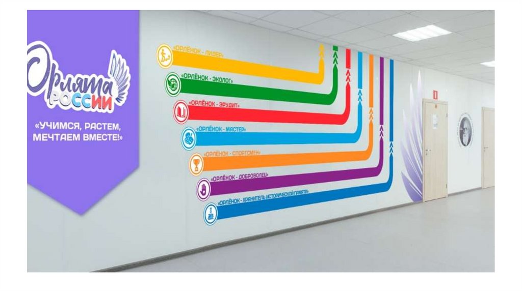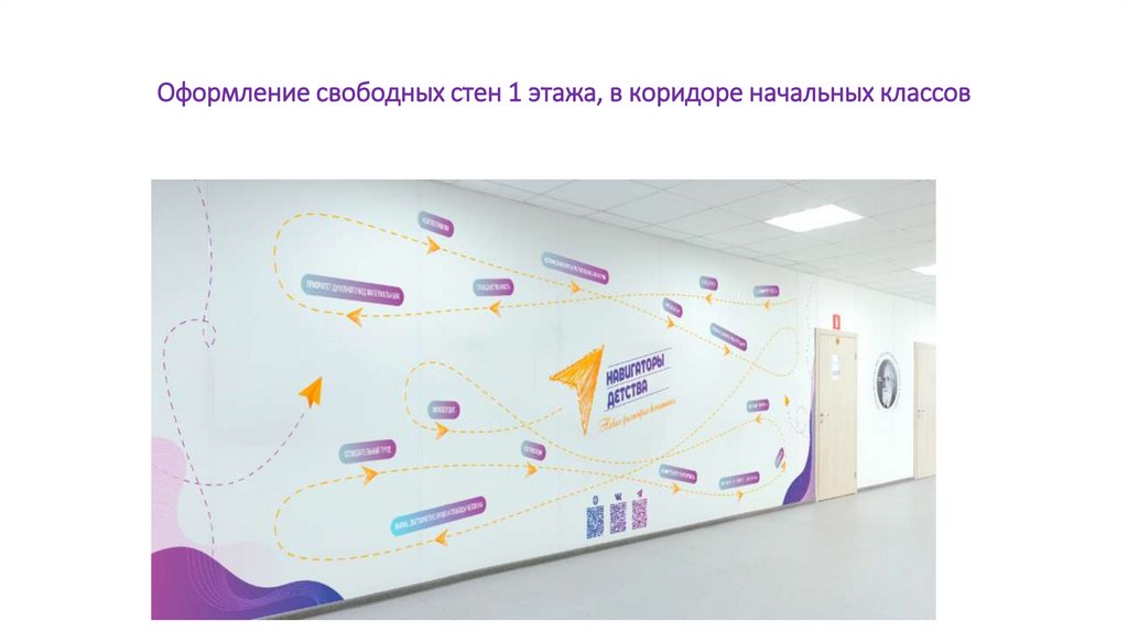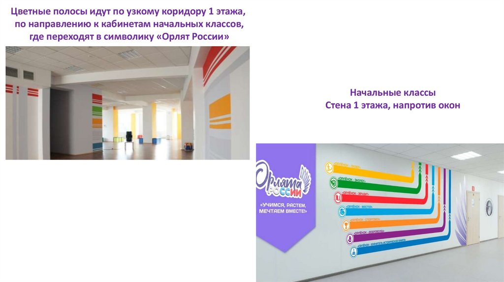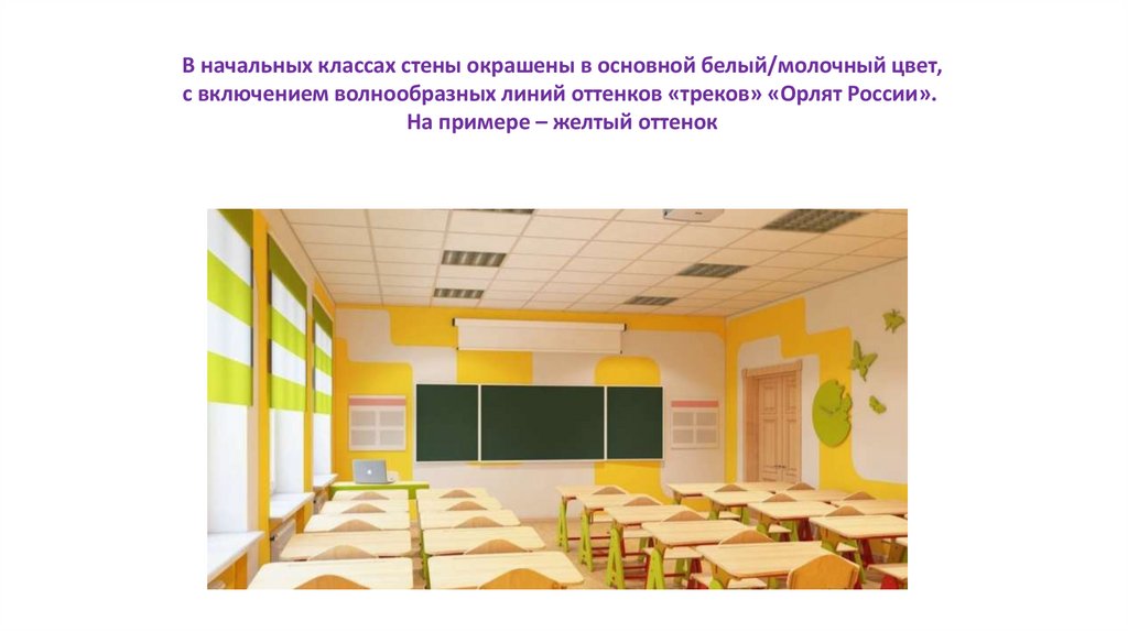 В начальных классах стены окрашены в основной белый/молочный цвет,с включением волнообразных линий оттенков «треков» «Орлят России».
