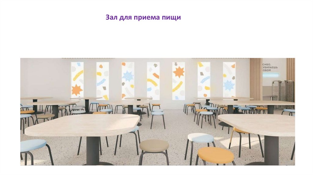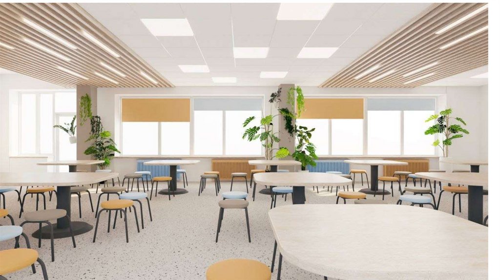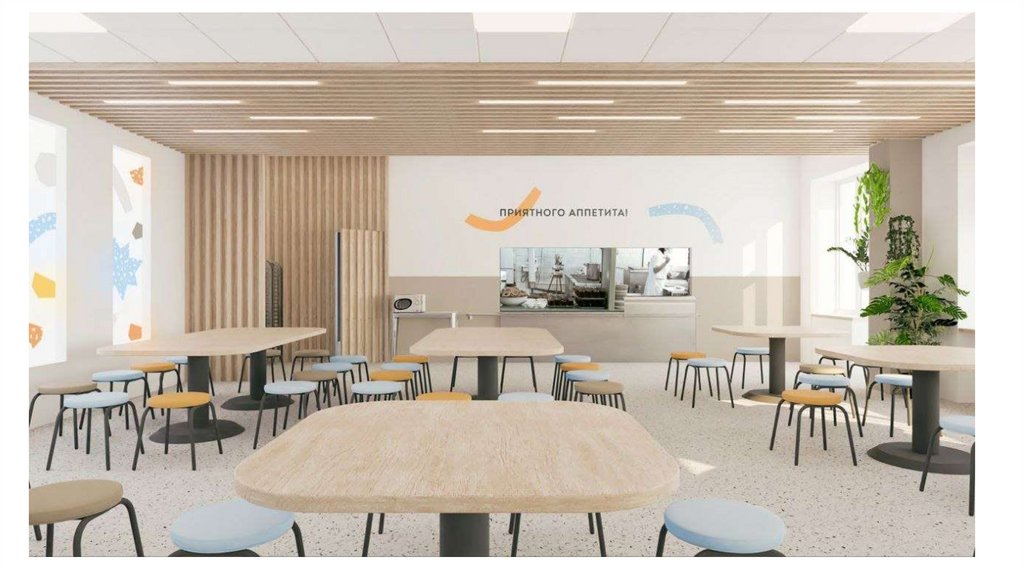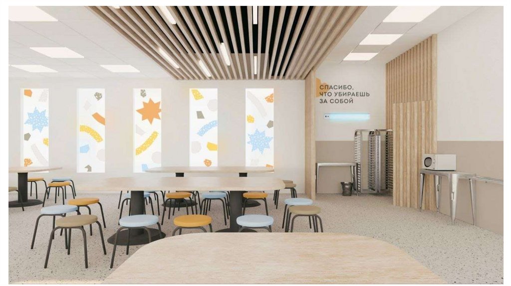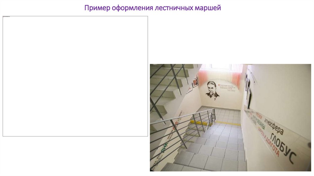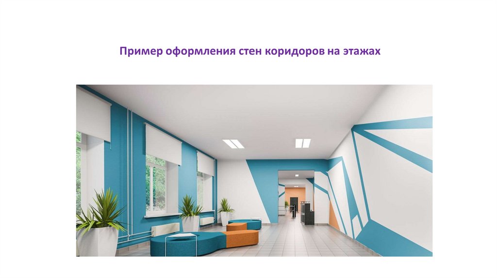 В начальных классах стены окрашены в основной белый/молочный цвет,с включением волнообразных линий оттенков «треков» «Орлят России».