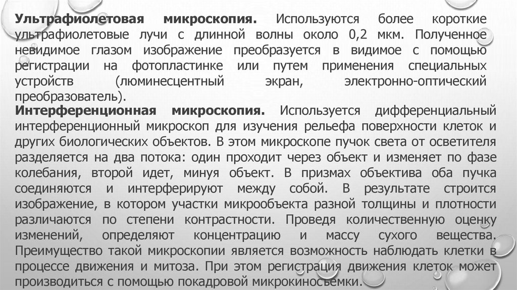 Ультрафиолетовая микроскопия. Используются более короткиеультрафиолетовые лучи с длинной волны около 0,2 мкм. Полученное