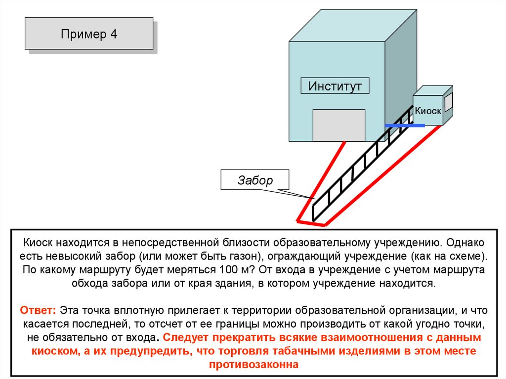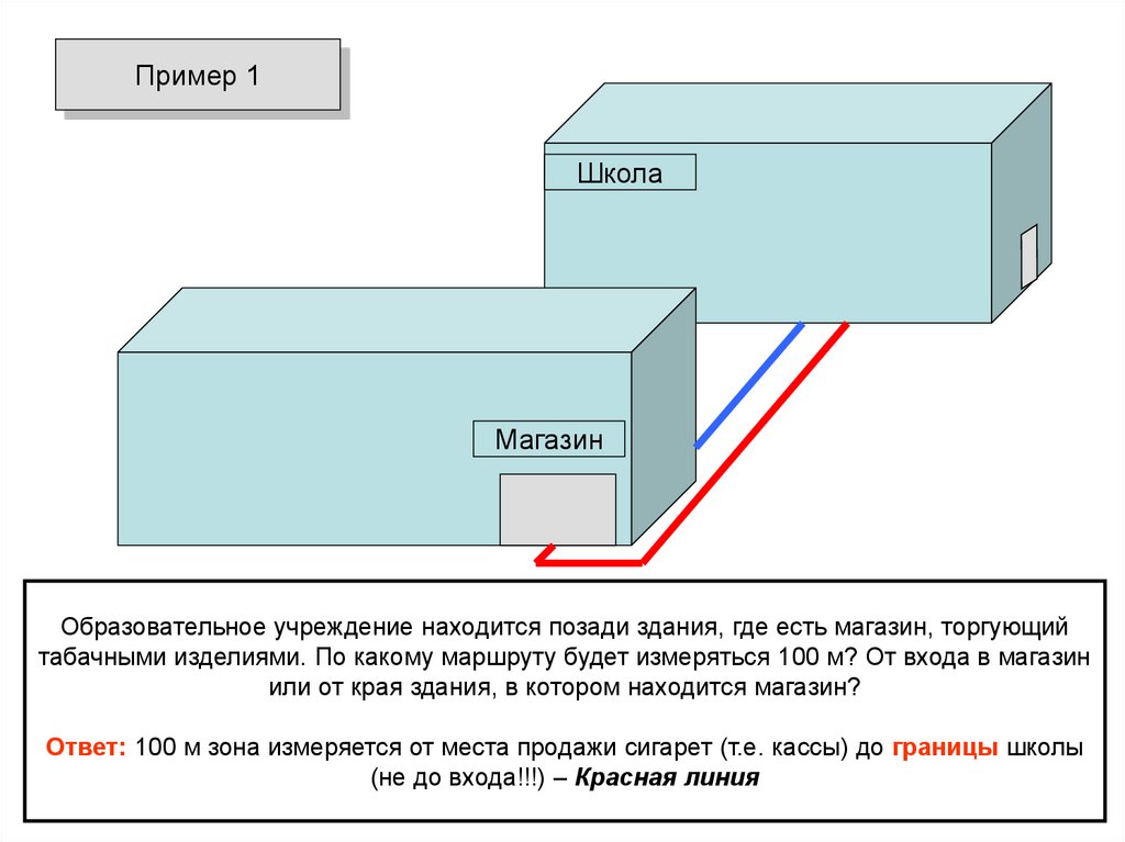 Ответ: 100 м зона измеряется от места продажи сигарет (т.е. кассы) до границы школы