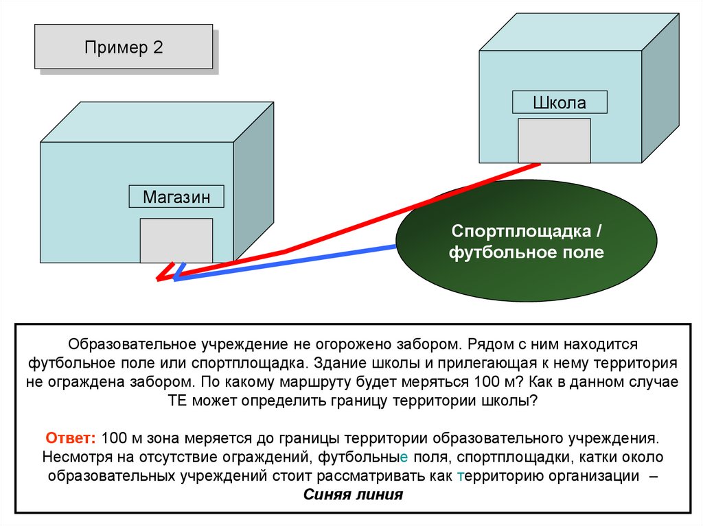 Согласно разъяснительным письмам из Роспотребнадзора :При определении 100-метровой зоны от границ территорий образовательных