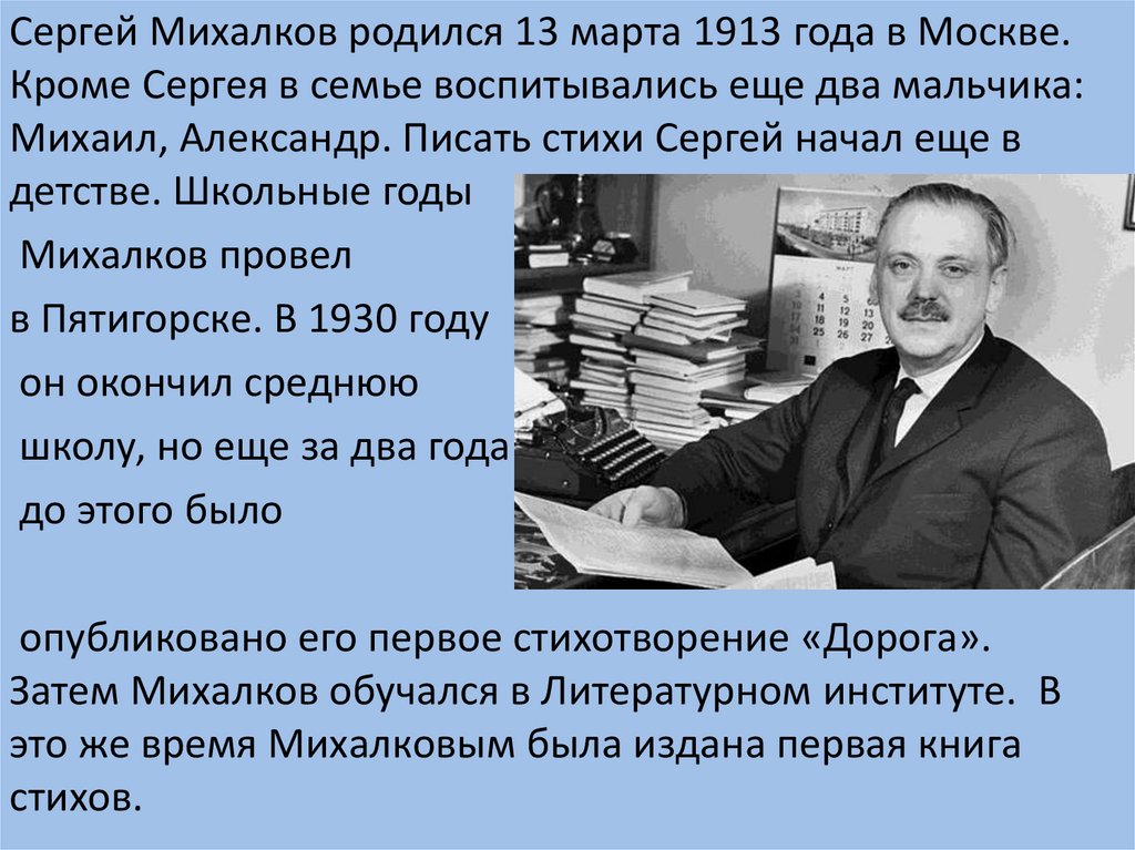 Сергей Михалков родился 13 марта 1913 года в Москве.Кроме Сергея в семье воспитывались еще два мальчика: