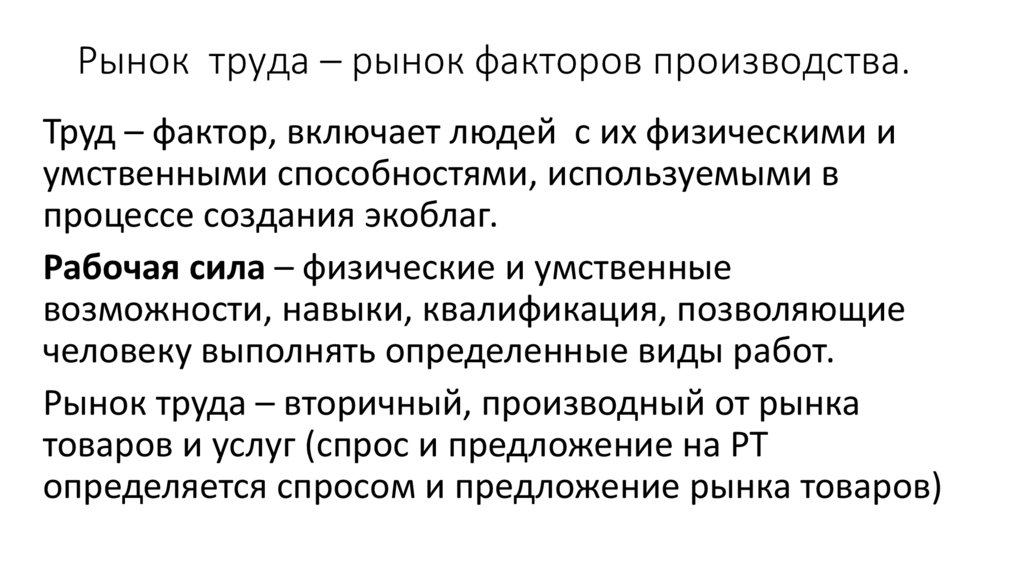 Рынок труда – рынок факторов производства.Труд – фактор, включает людей с их физическими и