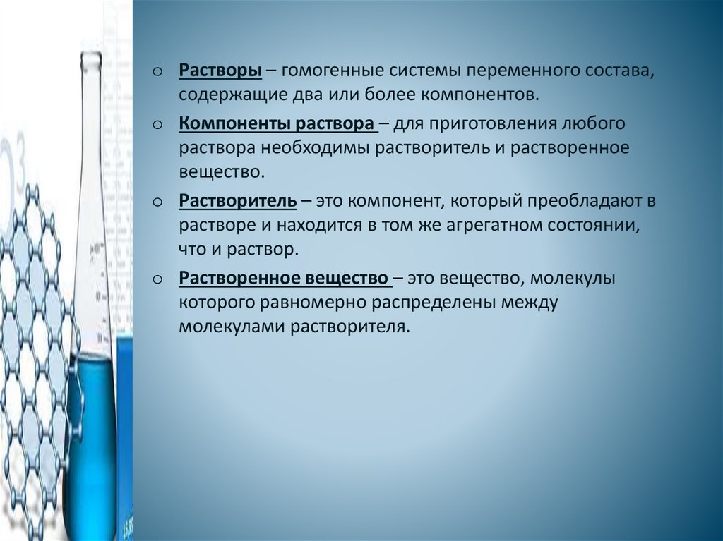 o Растворы – гомогенные системы переменного состава,содержащие два или более компонентов.
