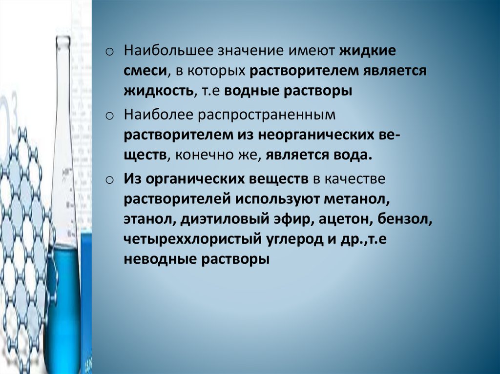 o Наибольшее значение имеют жидкиесмеси, в которых растворителем является