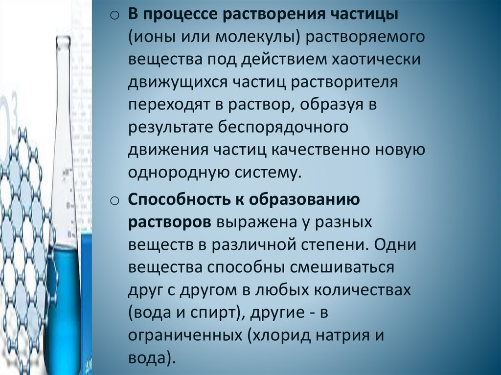 o В процессе растворения частицы(ионы или молекулы) растворяемого