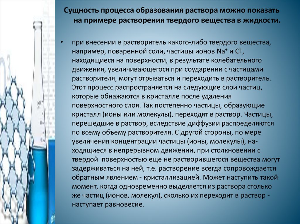 Сущность процесса образования раствора можно показатьна примере растворения твердого вещества в жидкости.