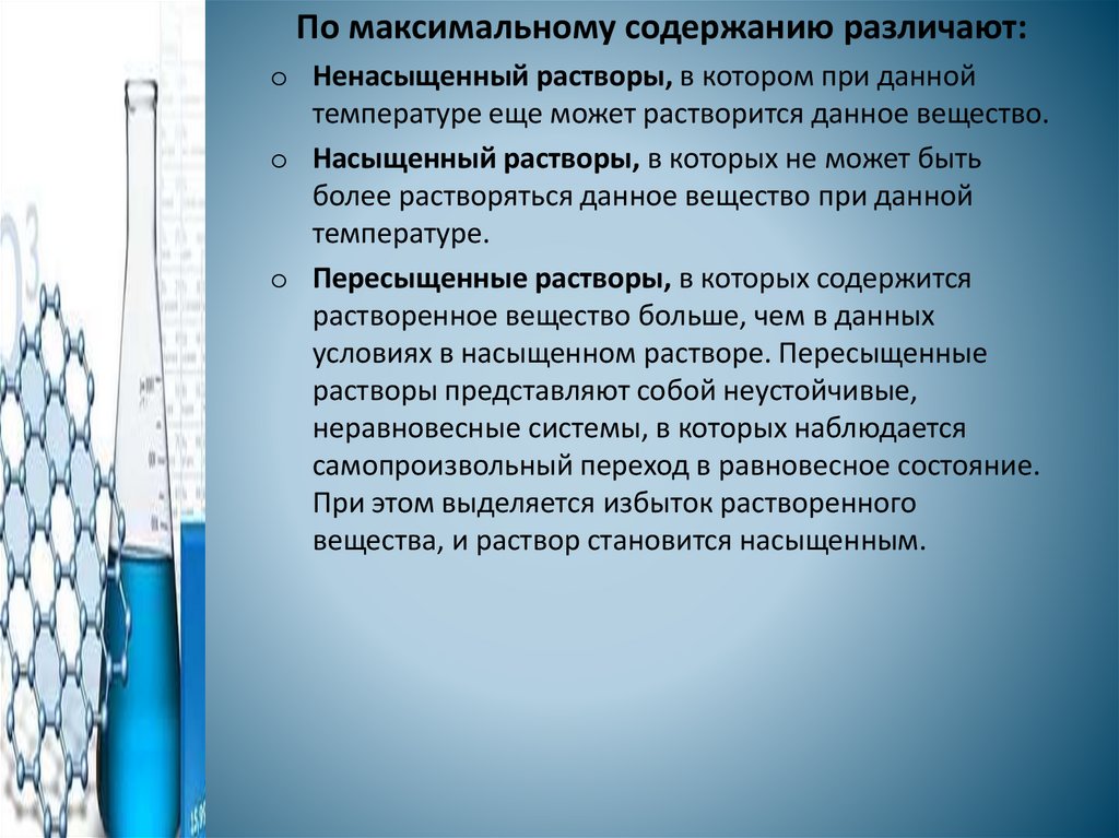 По максимальному содержанию различают:o Ненасыщенный растворы, в котором при данной