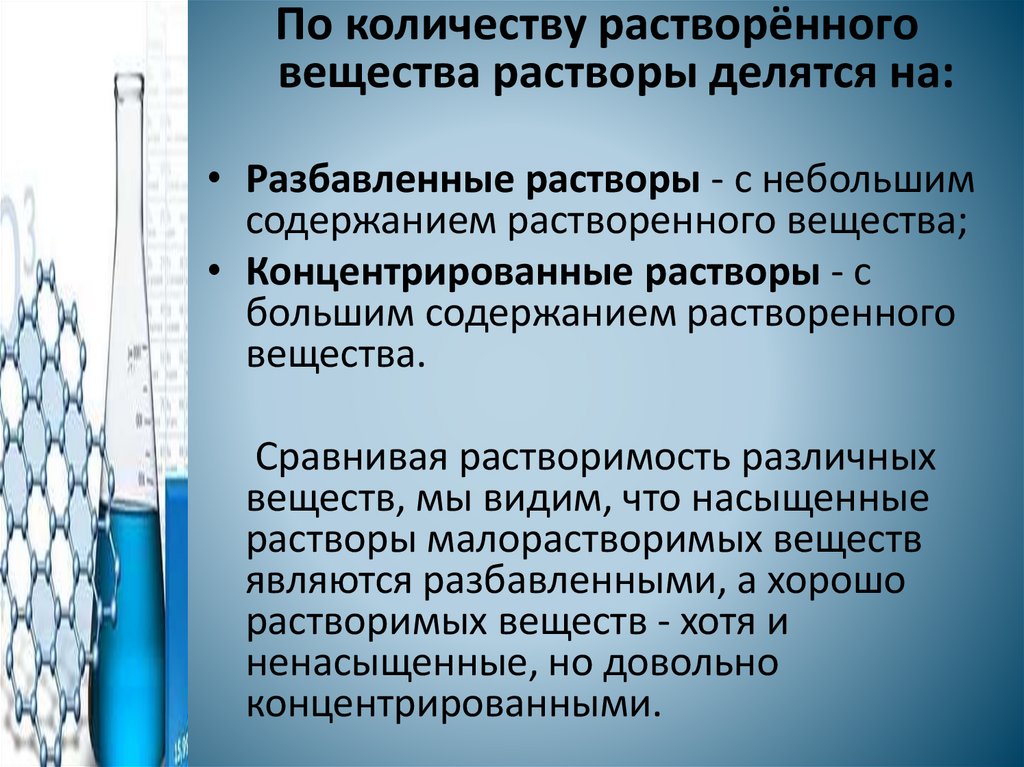 По количеству растворённоговещества растворы делятся на: