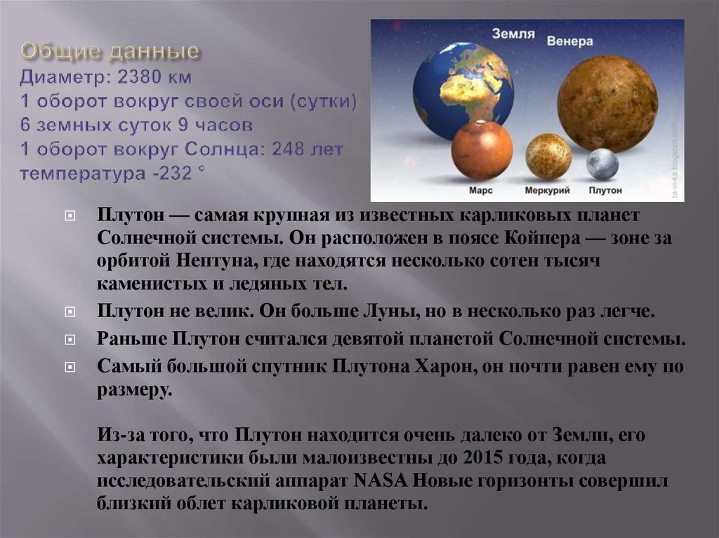 Плутон — самая крупная из известных карликовых планетСолнечной системы. Он расположен в поясе Койпера — зоне за