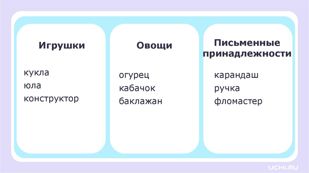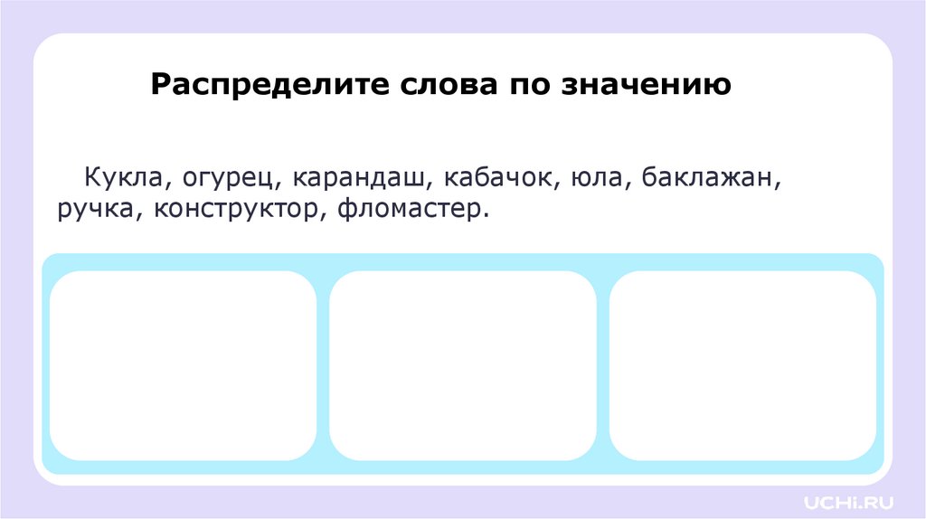 Распределите слова по значениюКукла, огурец, карандаш, кабачок, юла, баклажан,