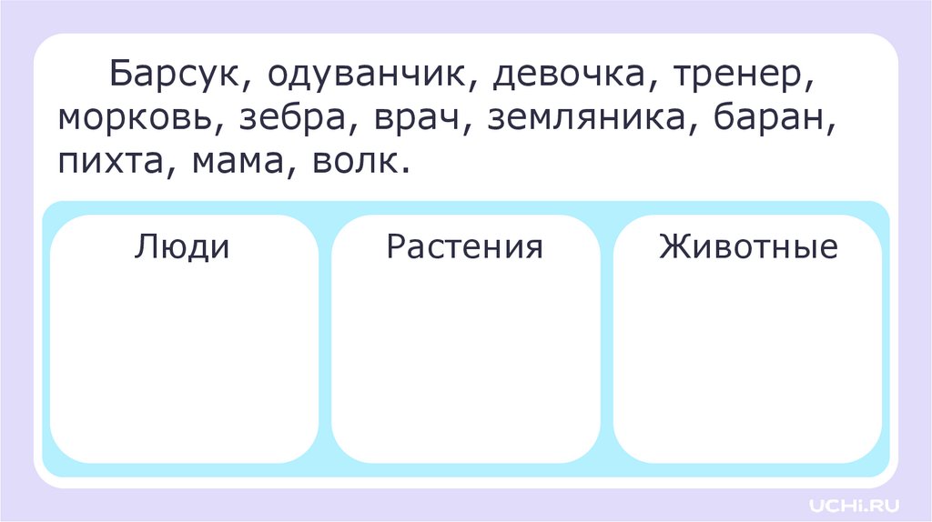 Барсук, одуванчик, девочка, тренер,морковь, зебра, врач, земляника, баран,