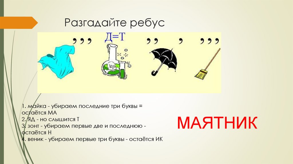 Разгадайте ребус1. майка - убираем последние три буквы =