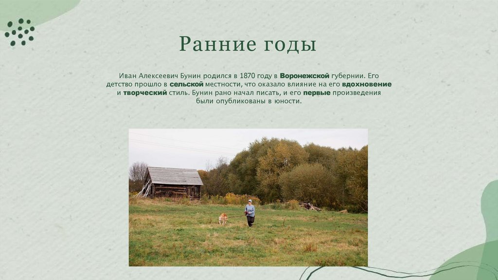 Ранние годыИван Алексеевич Бунин родился в 1870 году в Воронежской губернии. Его