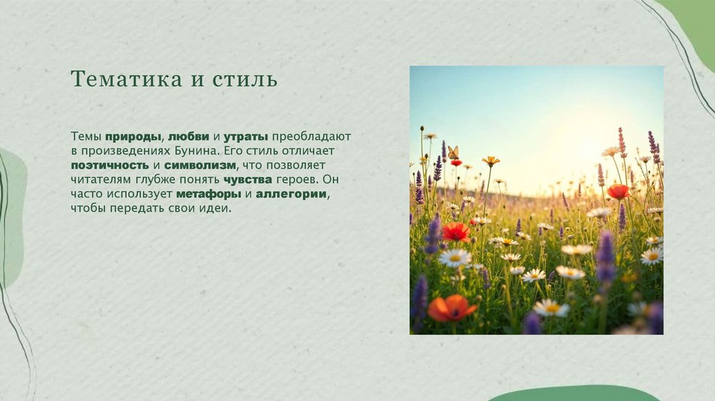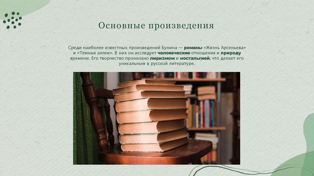 и «Темные аллеи». В них он исследует человеческие отношения и природу