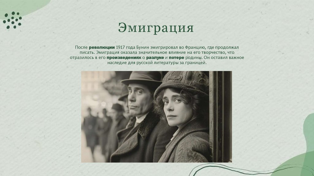 ЭмиграцияПосле революции 1917 года Бунин эмигрировал во Францию, где продолжал