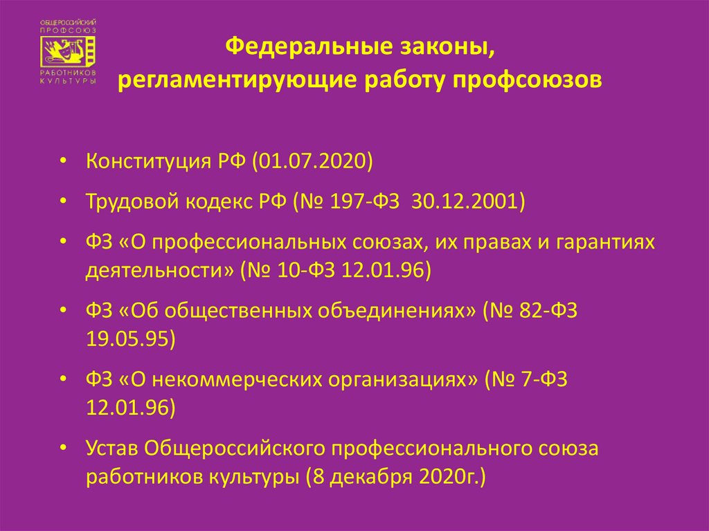 • ФЗ «О профессиональных союзах, их правах и гарантиях