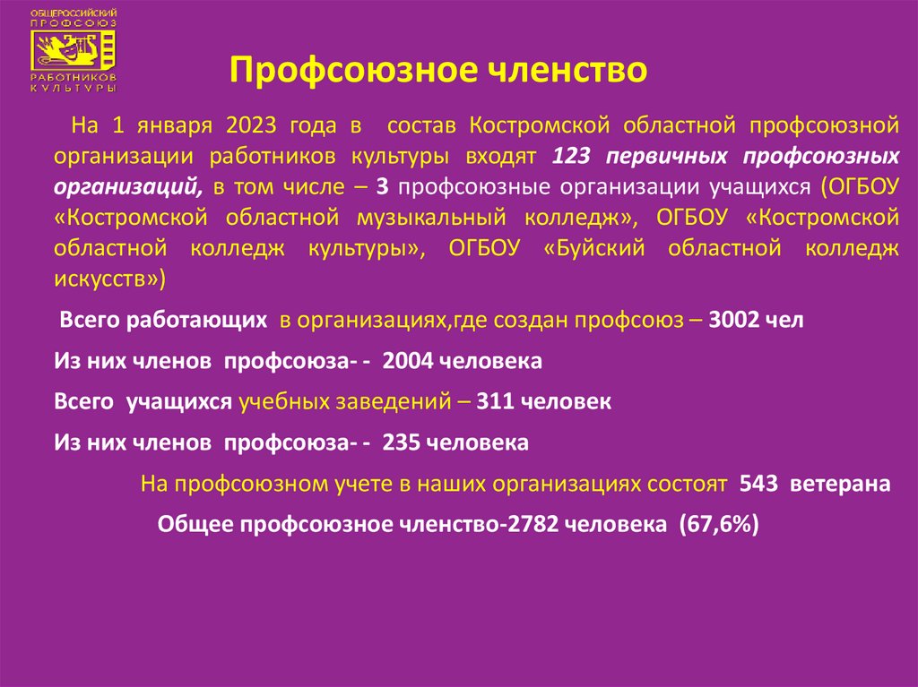 Профсоюзное членствоНа 1 января 2023 года в состав Костромской областной профсоюзной