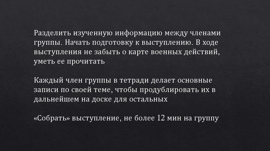 Разделить изученную информацию между членамигруппы. Начать подготовку к выступлению. В ходе
