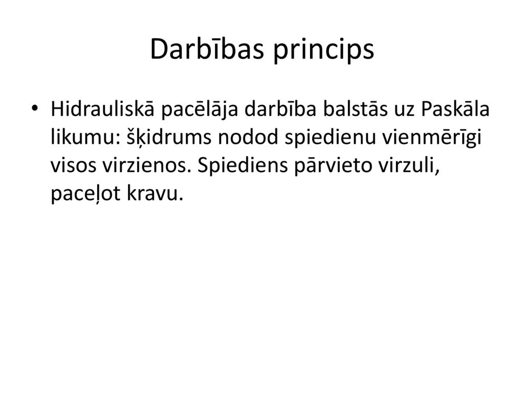 Darbības princips• Hidrauliskā pacēlāja darbība balstās uz Paskāla